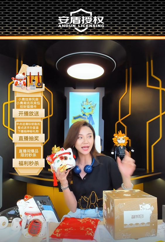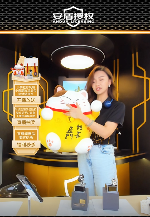 ▲主播展示ANDUN IP MART合作IP招财猫陶瓷摆件、毛绒公仔产品