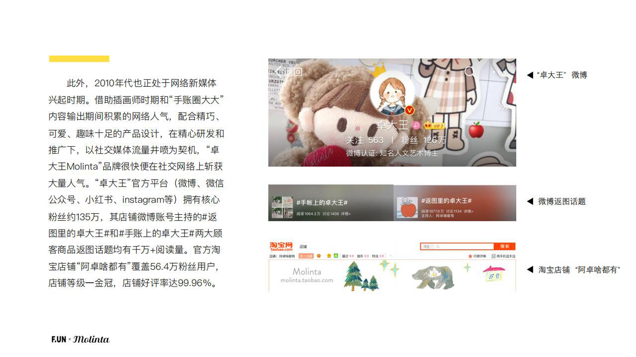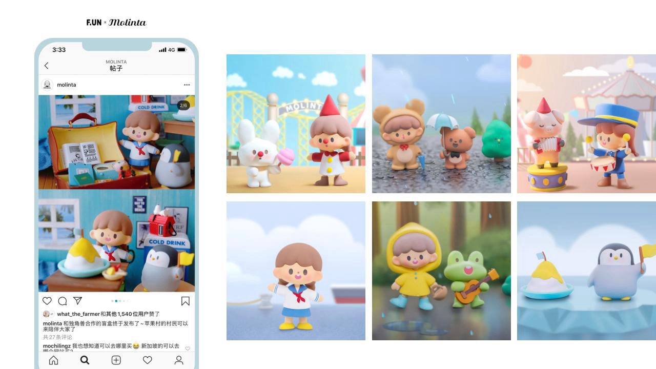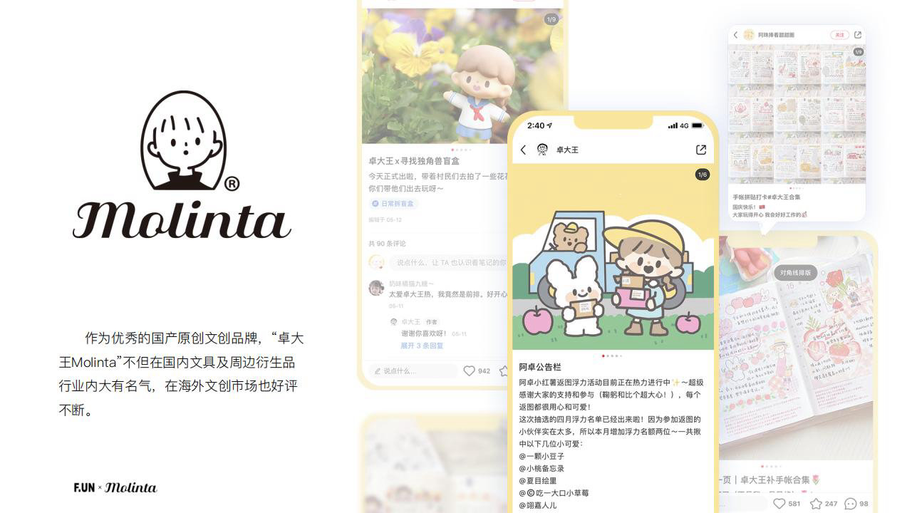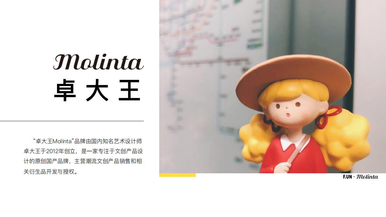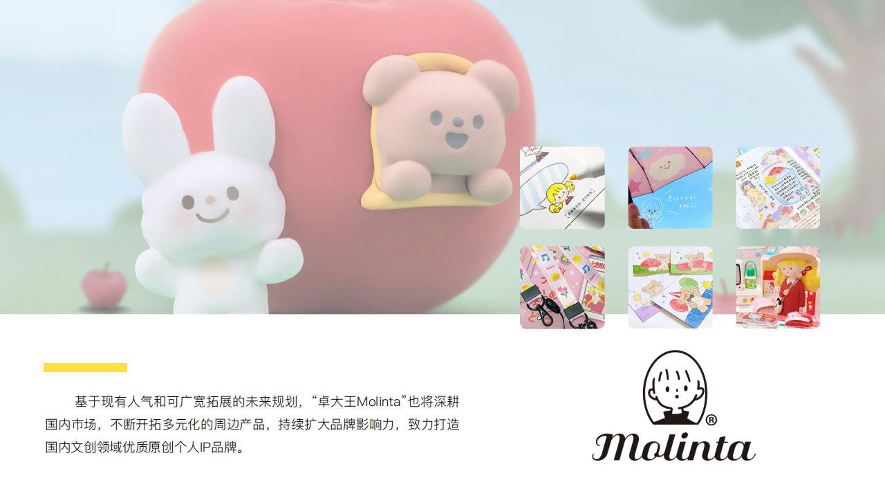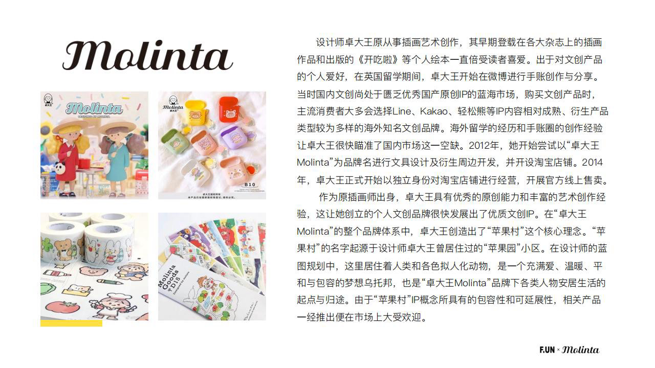 在“卓⼤王Molinta”的整个品牌体系中,卓⼤王创造出了“苹果村”这个核⼼理念。“苹果村”的名字起源于设计师卓⼤王曾居住过的“苹果园”⼩区。在设计师的蓝图规划中,这⾥居住着⼈类和各⾊拟⼈化动物,是⼀个充满爱、温暖、平和与包容的梦想乌托邦,也是“卓⼤王Molinta”品牌下各类⼈物安居⽣活的起点与归途。