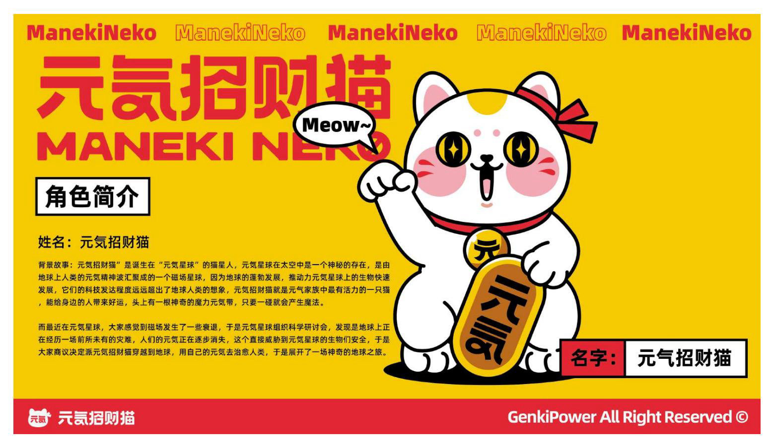元气招财猫是元气家族中有活力的一只猫,能给身边的人带来好运,头上有一根神奇的魔力元气带,只要一碰就会产生魔法。