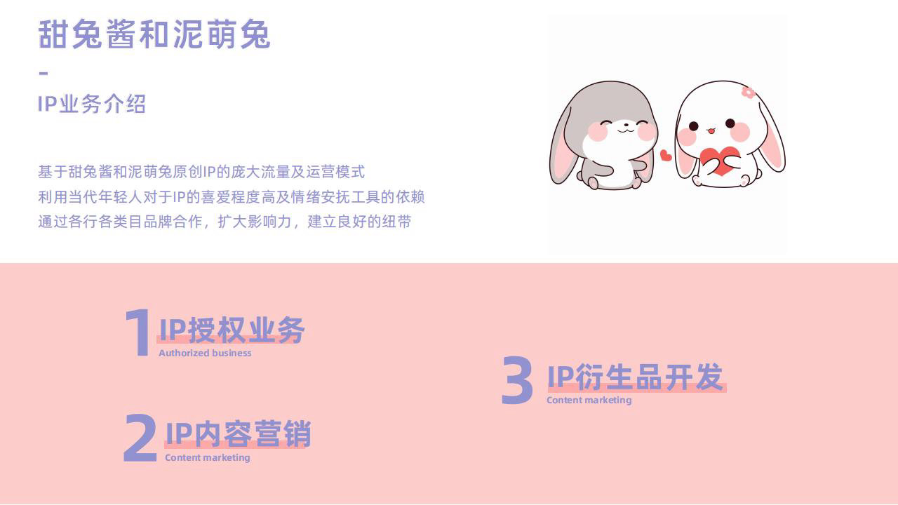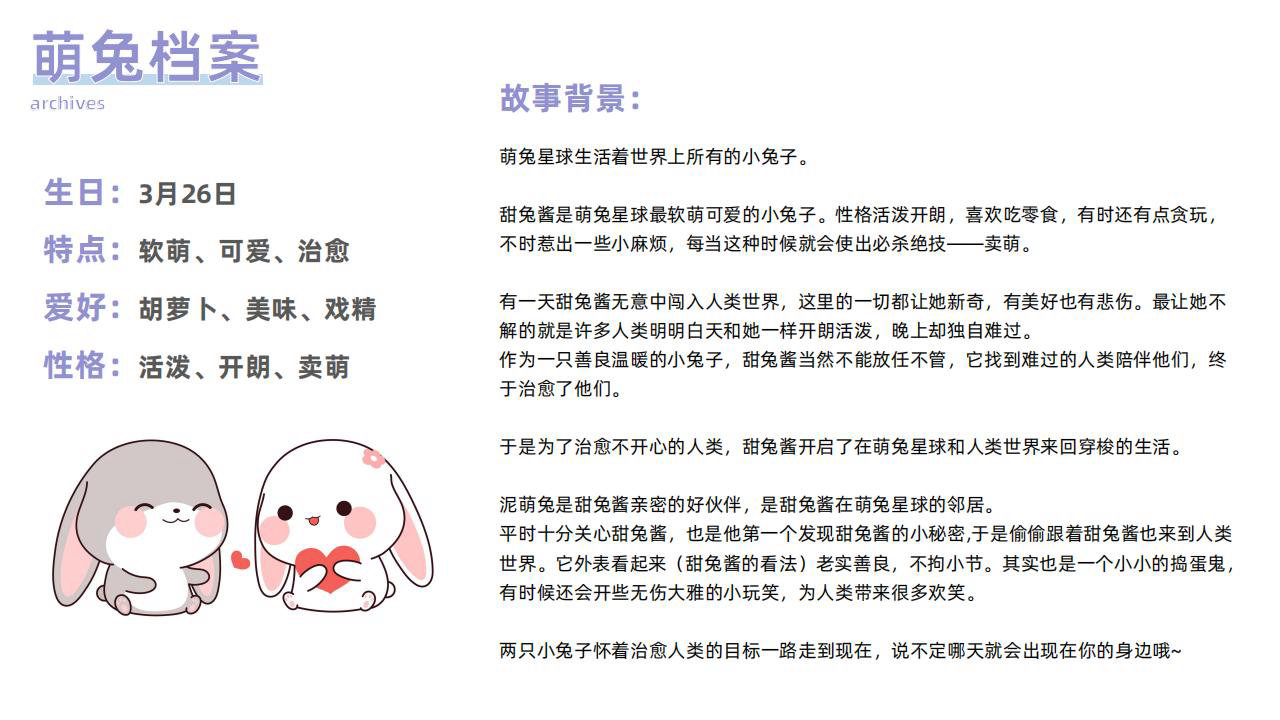 萌兔星球生活着世界上所有的小兔子。 甜兔酱是萌兔星球软萌可爱的小兔子。性格活泼开朗,喜欢吃零食,有时还有点贪玩, 不时惹出一些小麻烦,每当这种时候就会使出必杀绝技——卖萌。泥萌兔是甜兔酱亲密的好伙伴,是甜兔酱在萌兔星球的邻居。