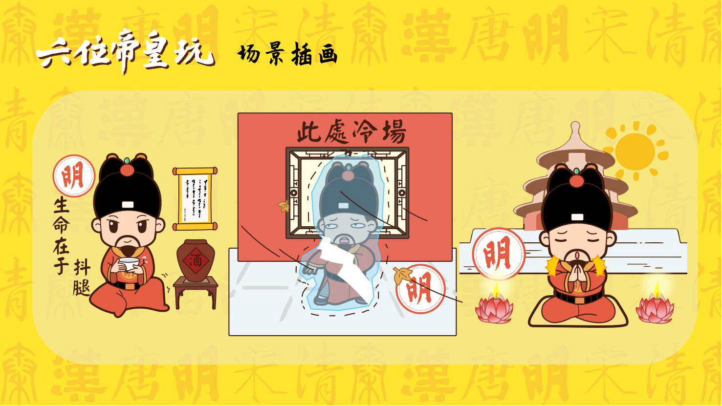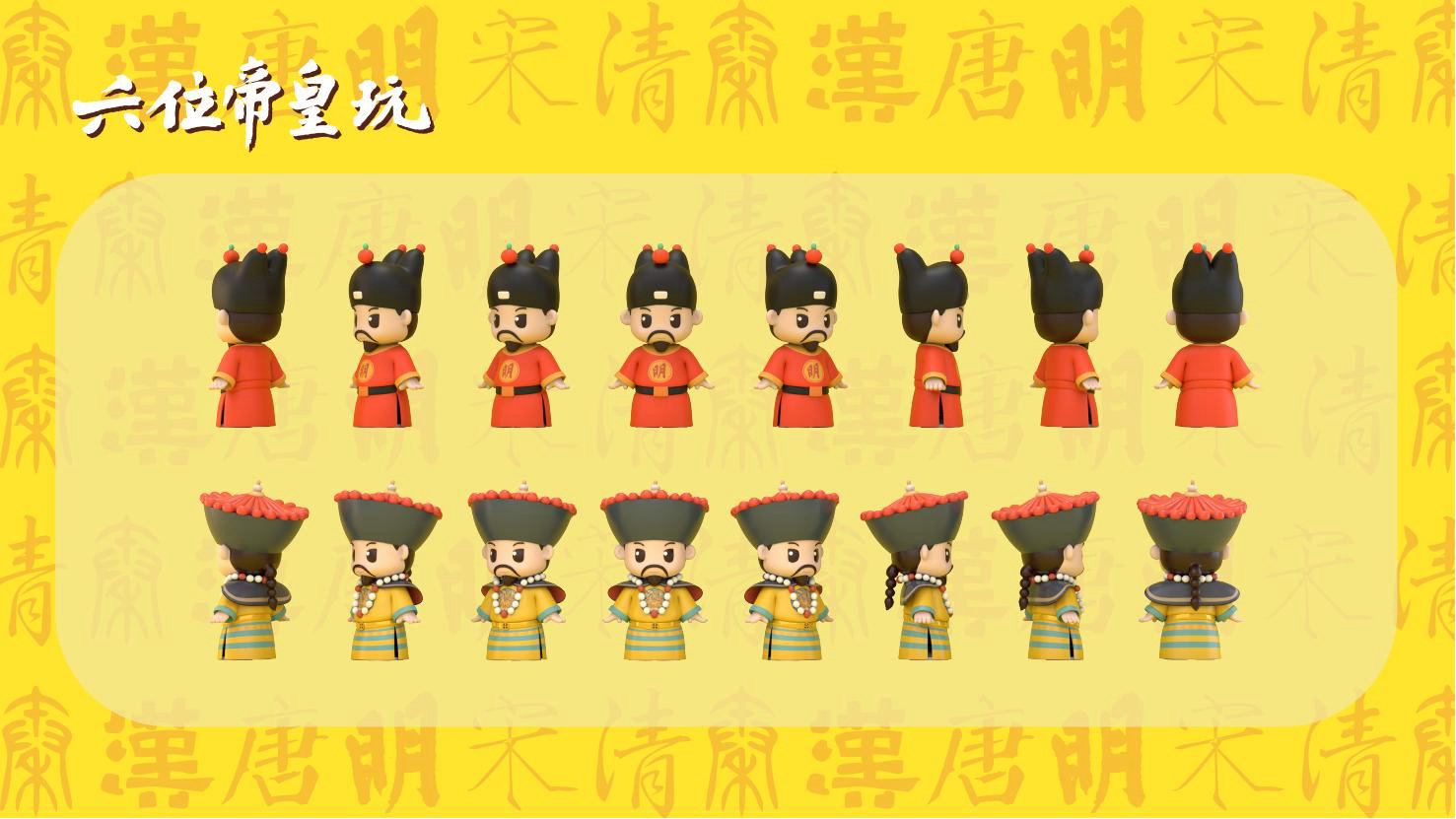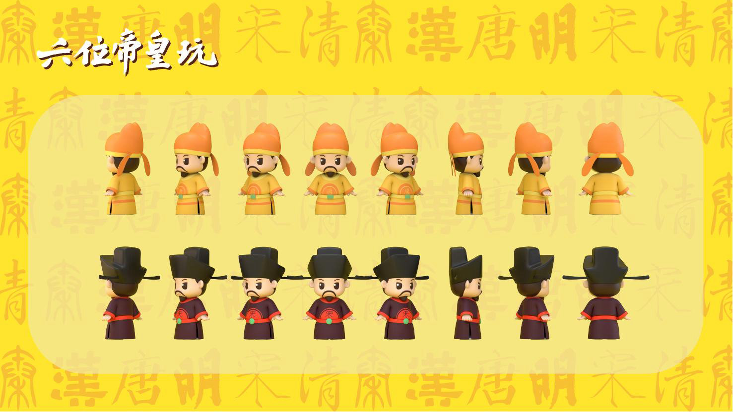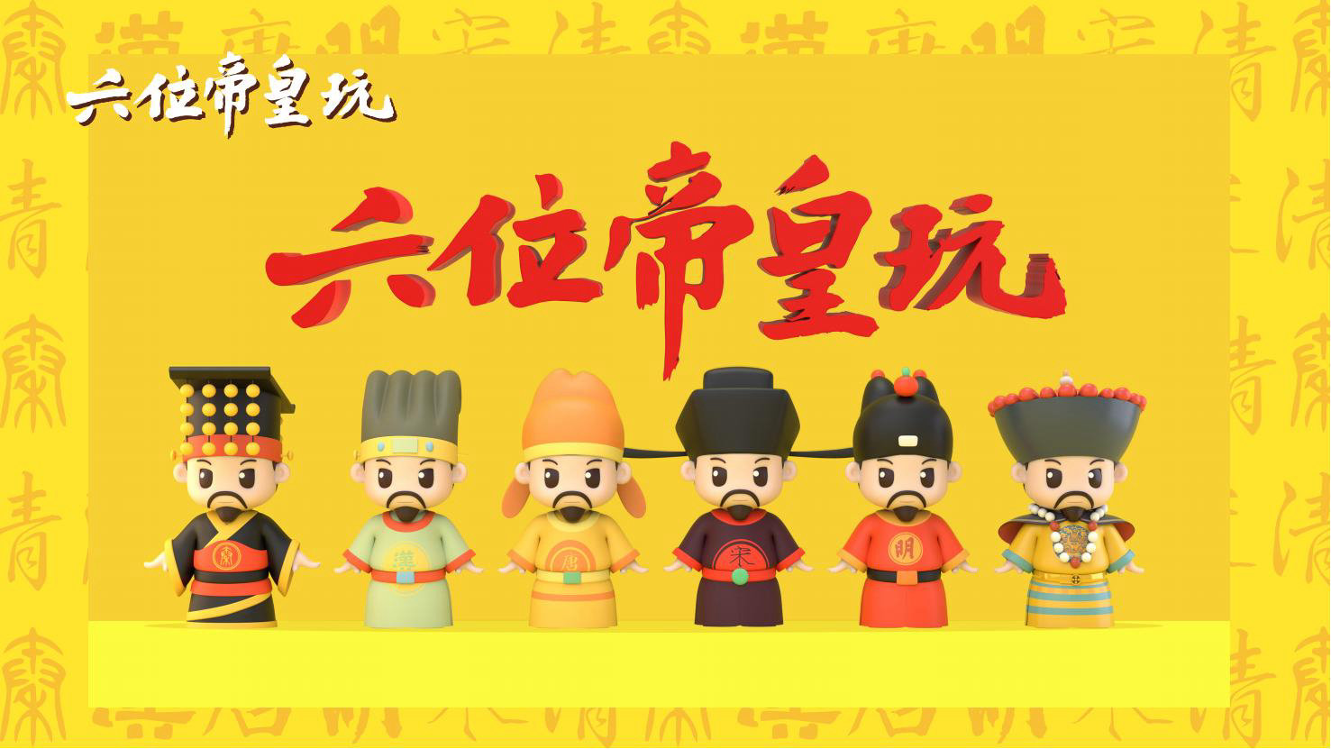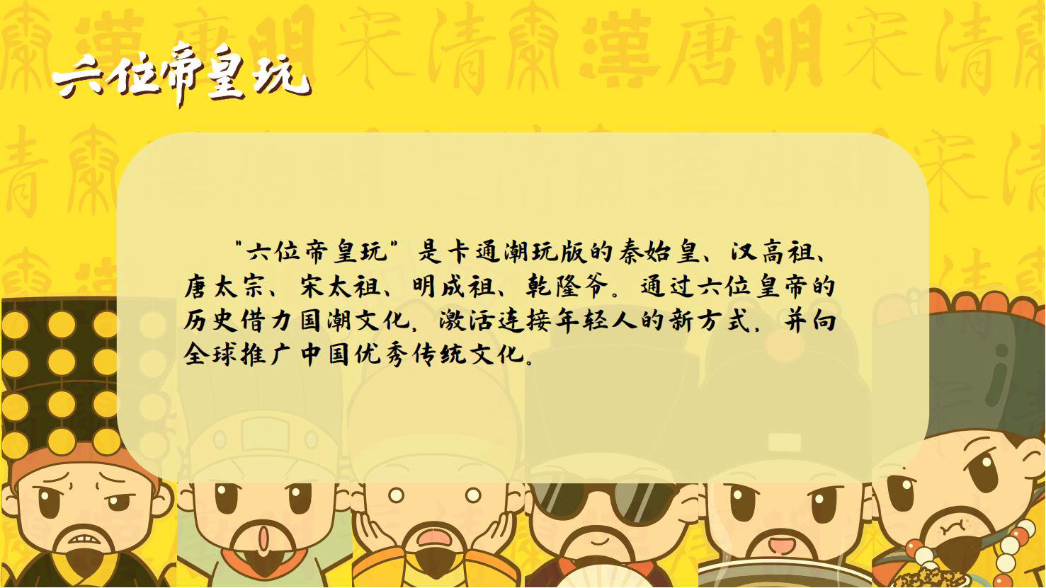 “六位帝皇玩”是卡通潮玩版的秦始皇、汉高祖、唐太宗、宋太祖、明成祖、乾隆爷。通过六位皇帝的历史借力国潮文化,向全球推广中国优秀传统文化。