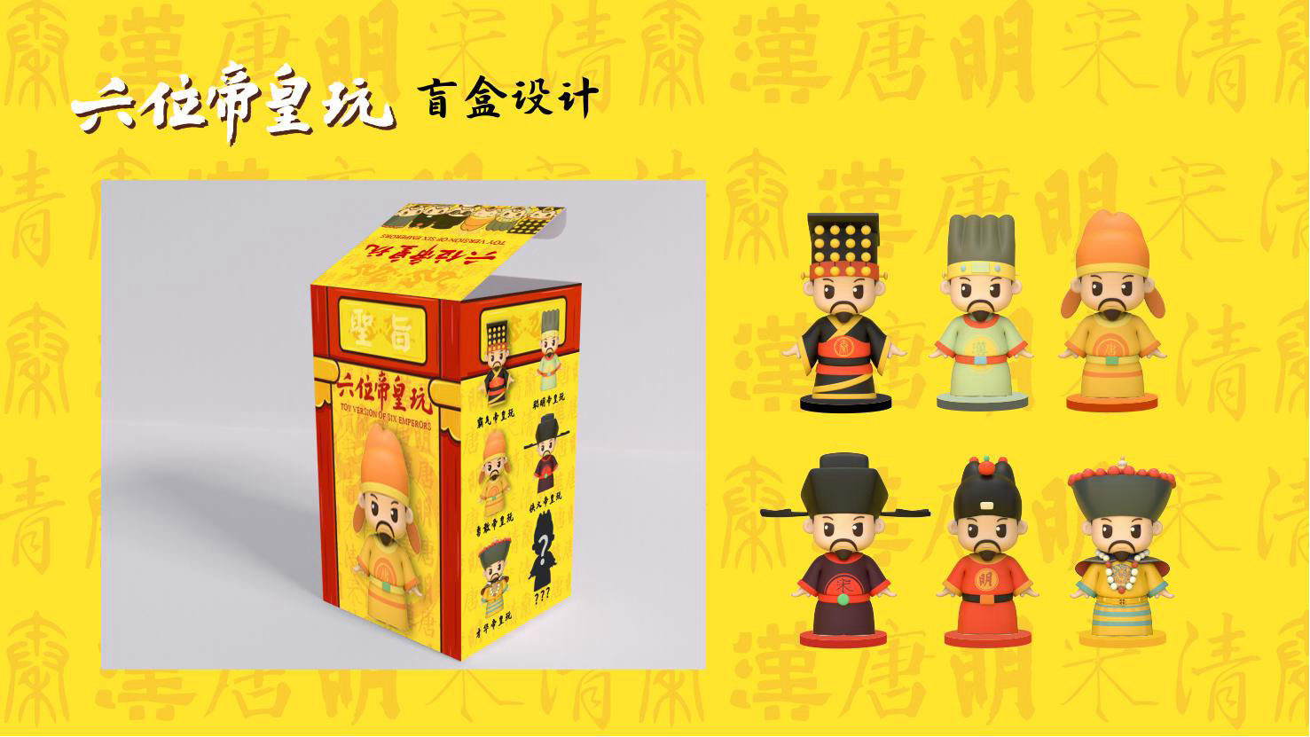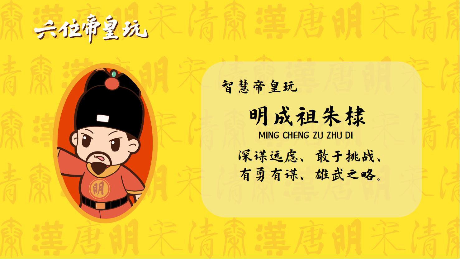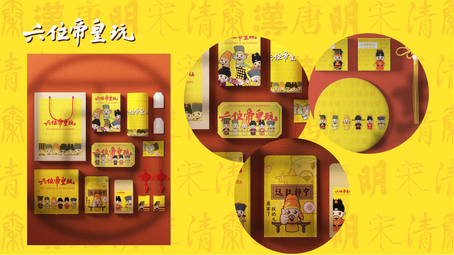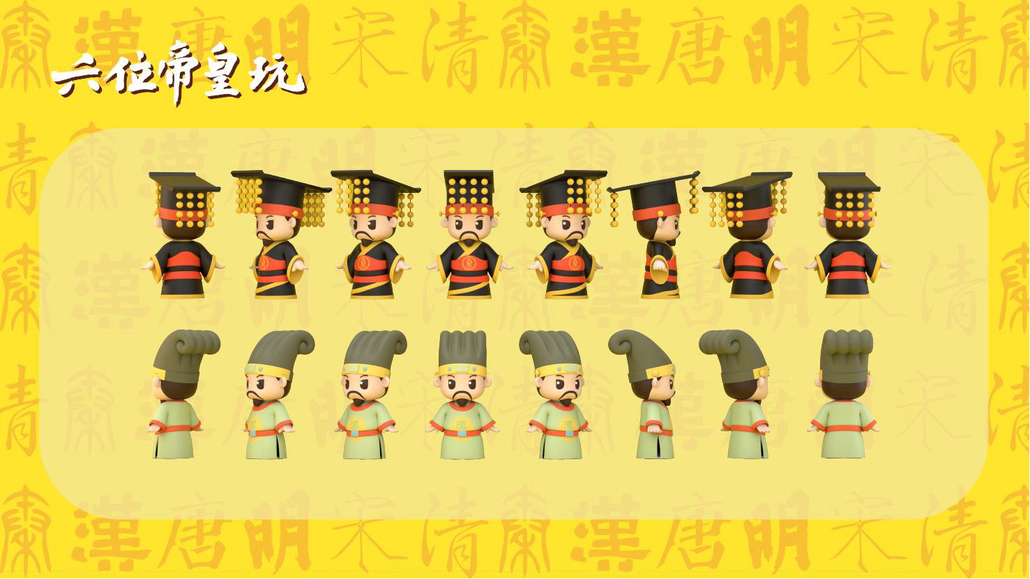 “六位帝皇玩”是卡通潮玩版的秦始皇、汉高祖、唐太宗、宋太祖、明成祖、乾隆爷。通过六位皇帝的历史借力国潮文化,向全球推广中国优秀传统文化。
