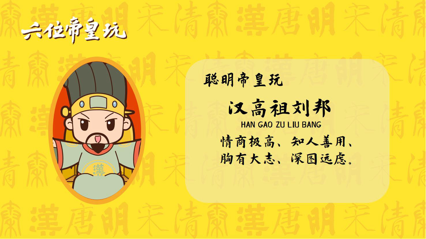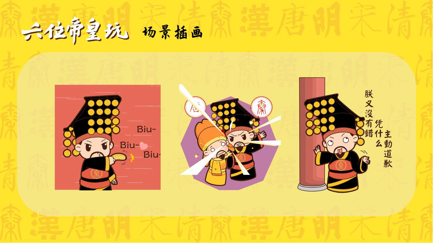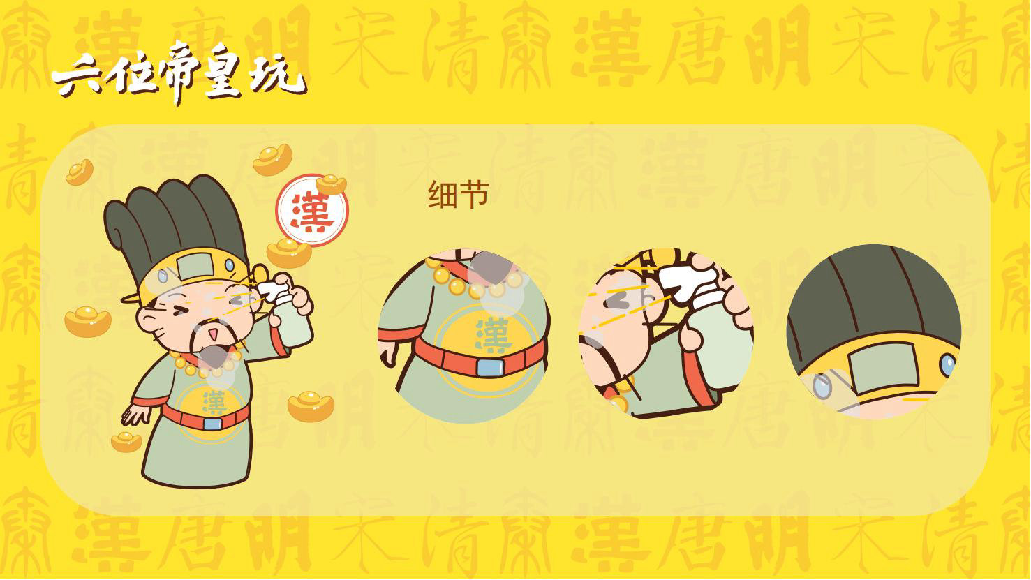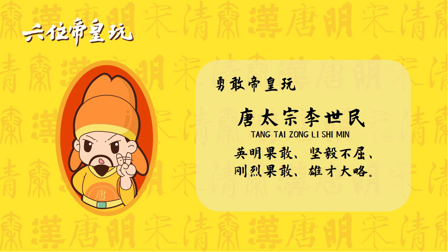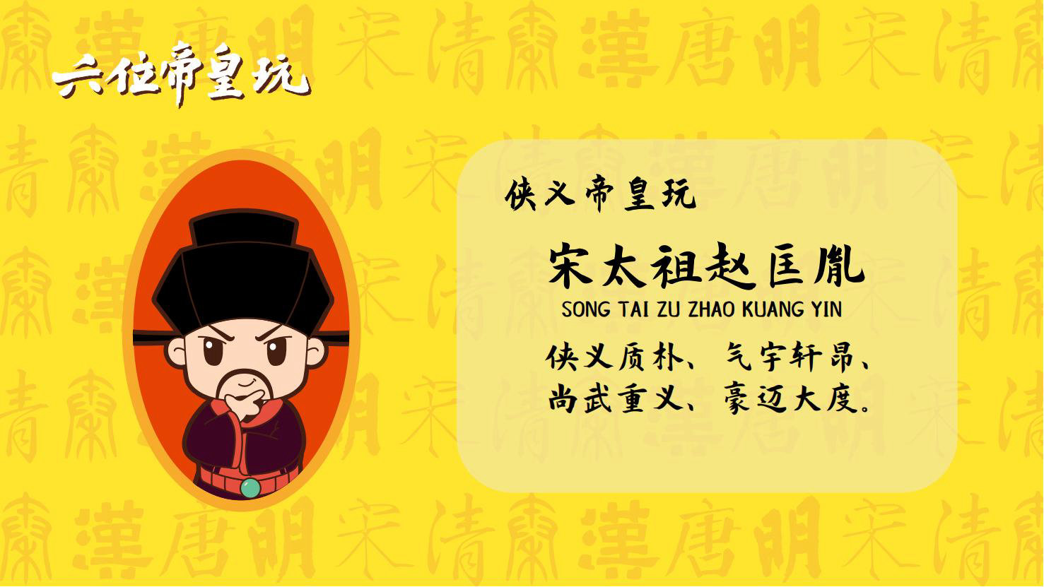 “六位帝皇玩”是卡通潮玩版的秦始皇、汉高祖、唐太宗、宋太祖、明成祖、乾隆爷。通过六位皇帝的历史借力国潮文化,向全球推广中国优秀传统文化。