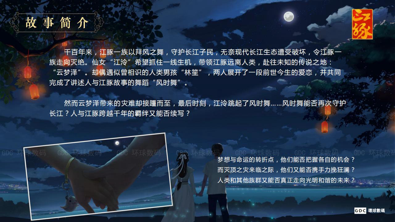 千百年来,江豚一族以拜风之舞,守护长江子民,无奈现代长江生态遭受破坏,令江豚一 族走向灭绝。仙女“江泠”希望抓住一线生机,带领江豚远离人类,赴往未知的传说之地: “云梦泽”。却偶遇似曾相识的人类男孩“林笙”,两人展开了一段前世今生的爱恋,并共同 完成了讲述人与江豚故事的舞蹈“风时舞”。