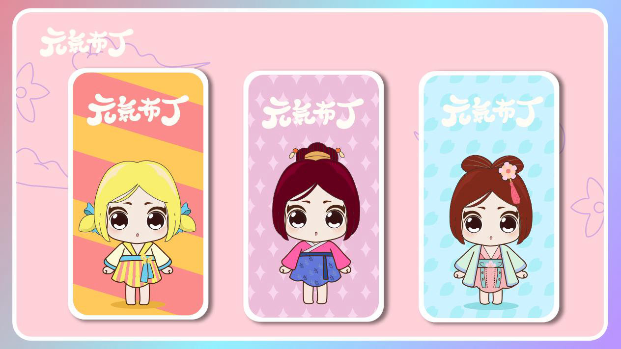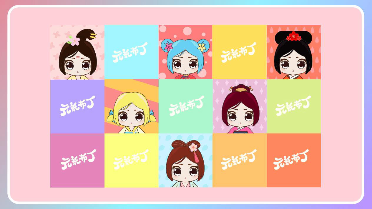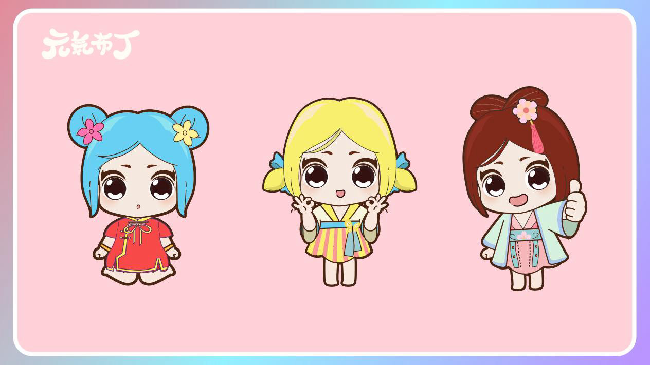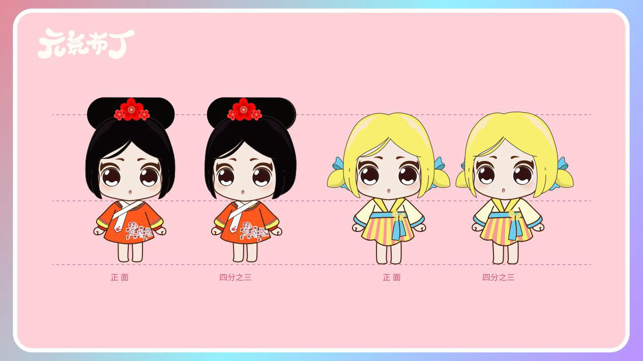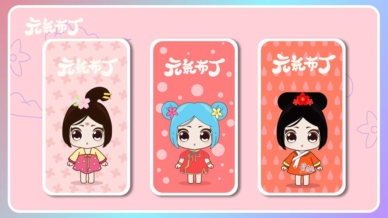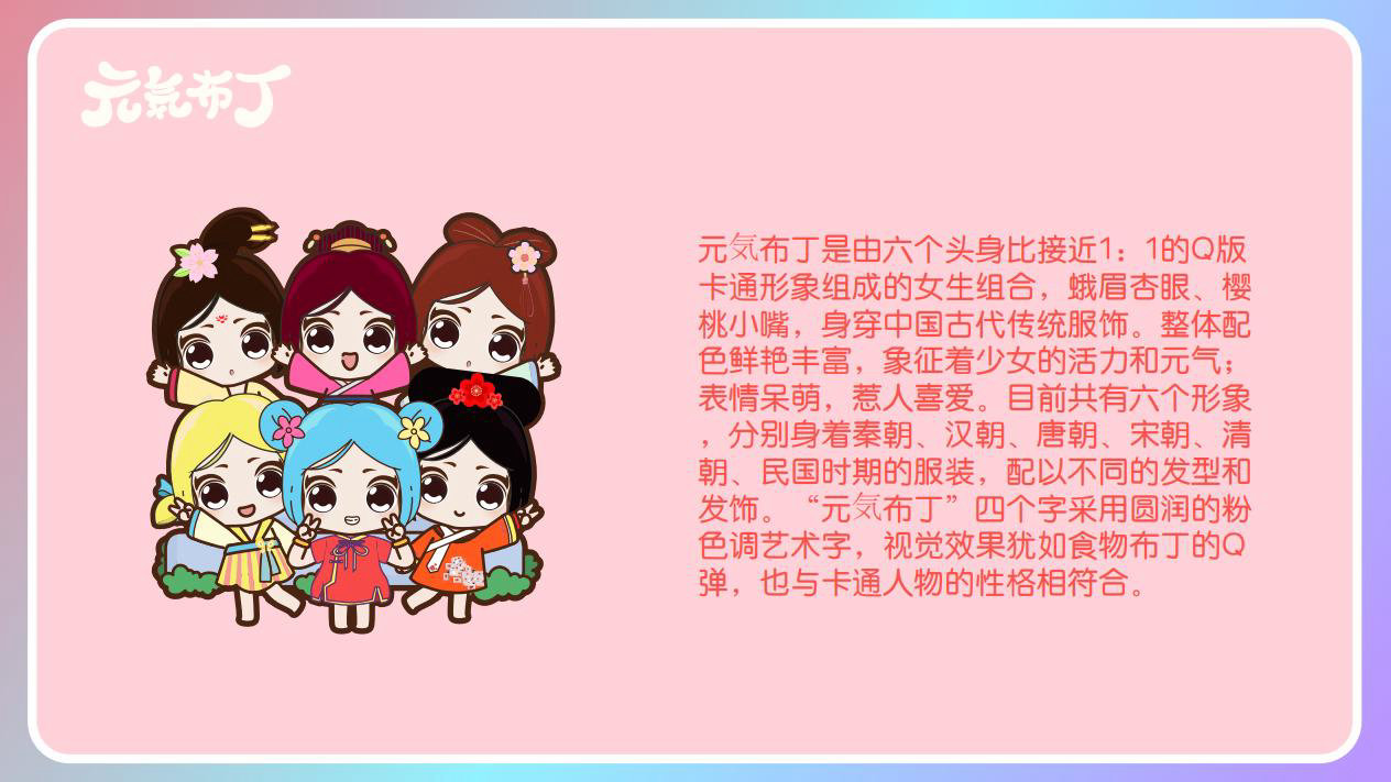 元気布丁是由六个头身比接近1:1的Q版卡通形象组成的女生组合,蛾眉杏眼、樱桃小嘴,身穿中国古代传统服饰。整体配色鲜艳丰富,象征着少女的活力和元气;表情呆萌,惹人喜爱。目前共有六个形象,分别身着秦朝、汉朝、唐朝、宋朝、清朝、民国时期的服装,配以不同的发型和发饰。