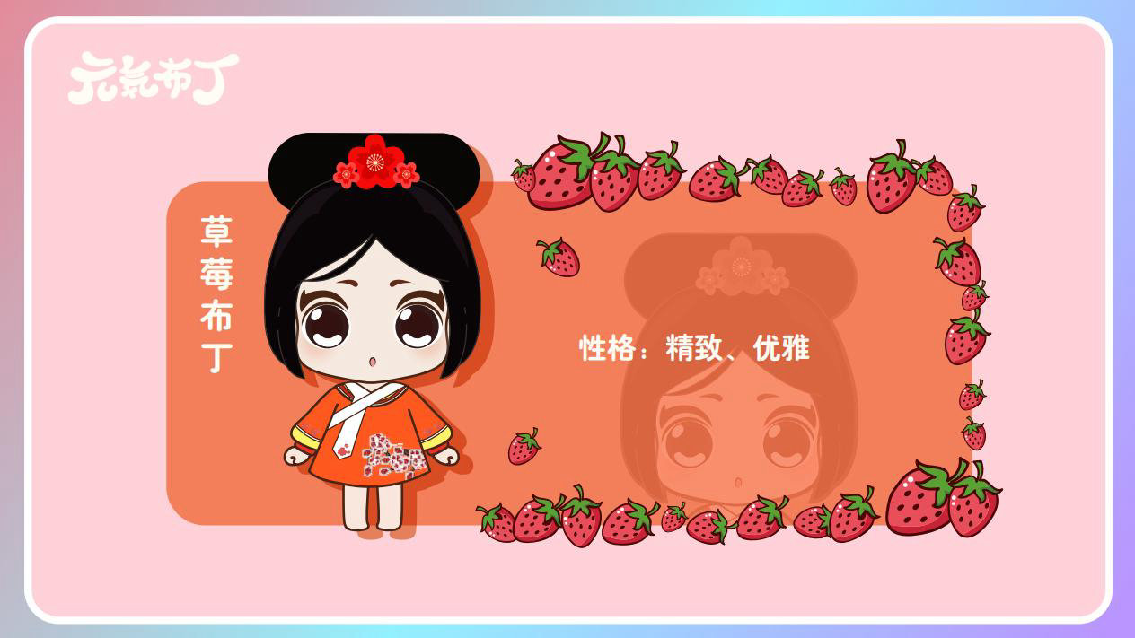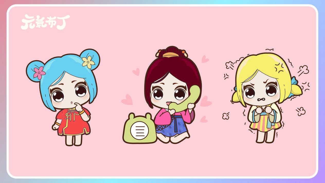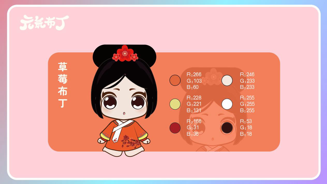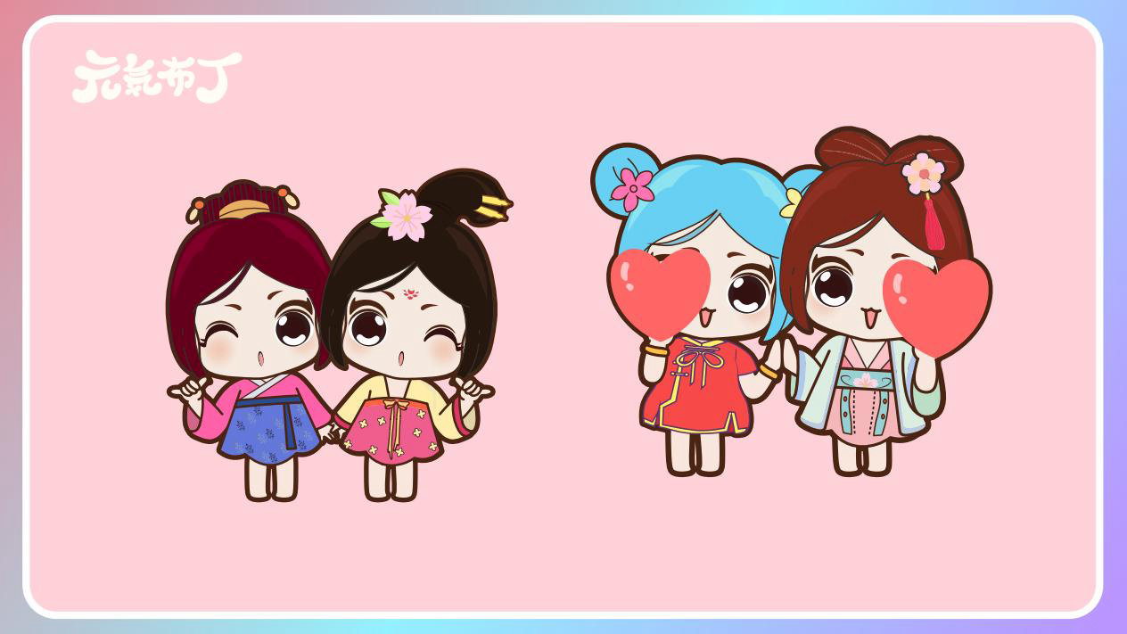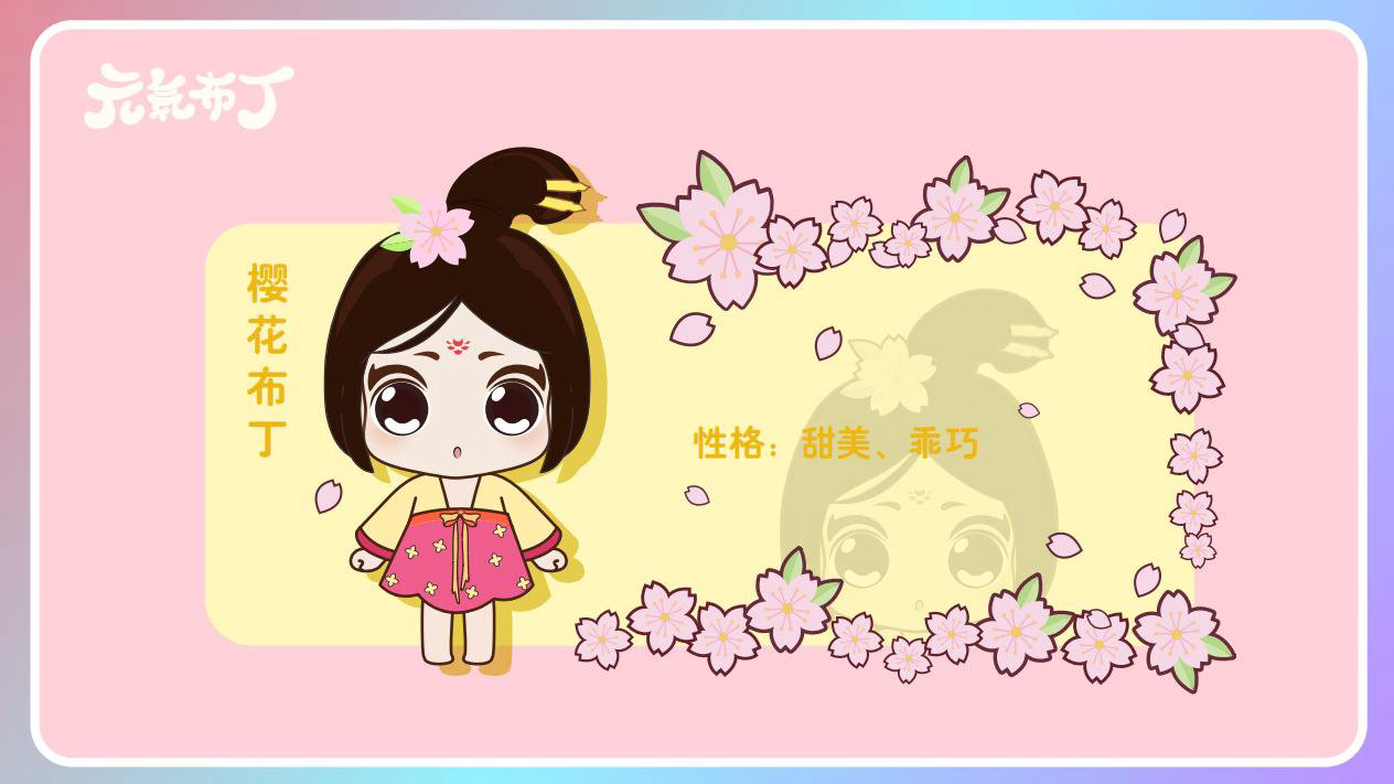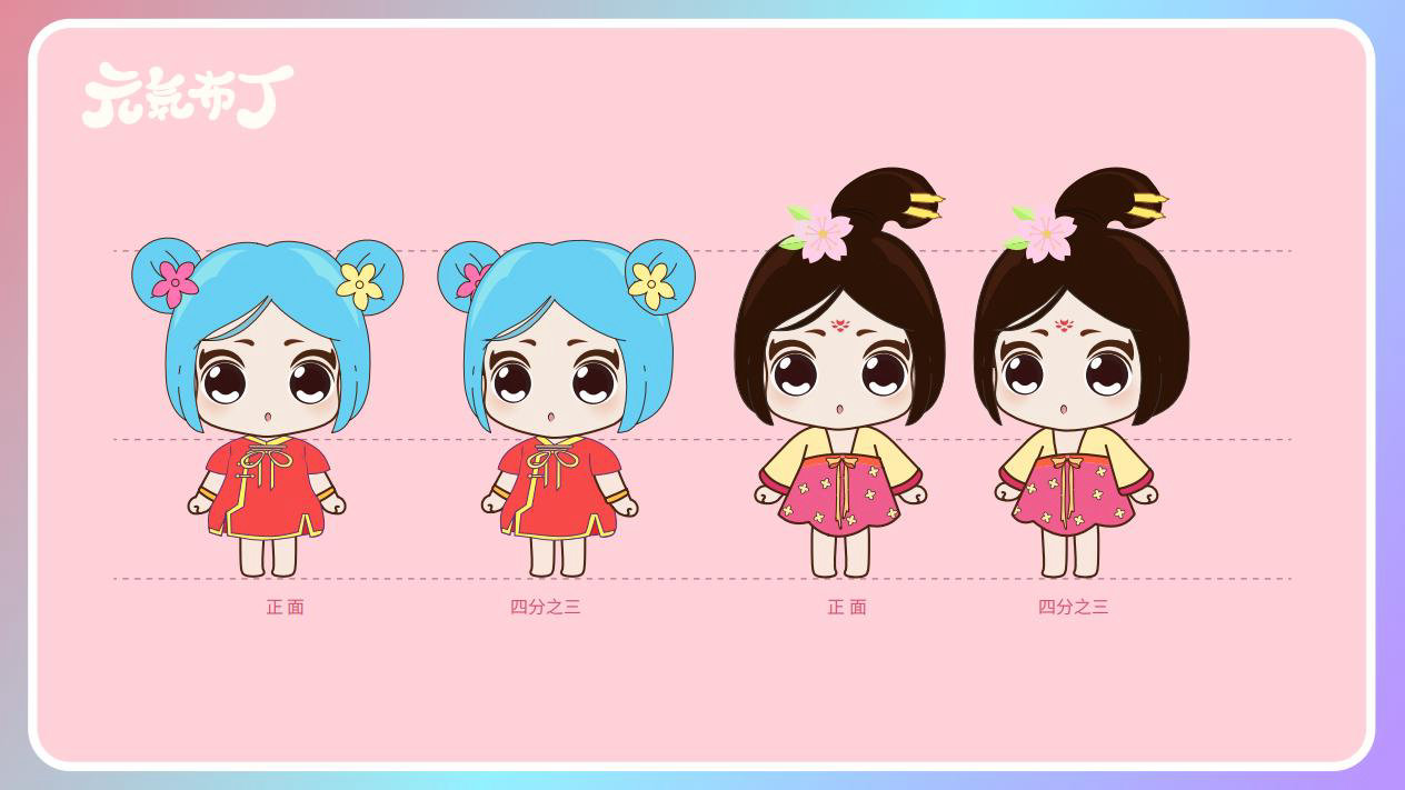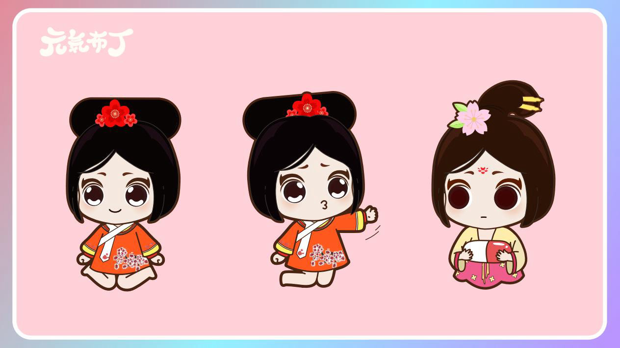 元気布丁是由六个头身比接近1:1的Q版卡通形象组成的女生组合,蛾眉杏眼、樱桃小嘴,身穿中国古代传统服饰。整体配色鲜艳丰富,象征着少女的活力和元气;表情呆萌,惹人喜爱。目前共有六个形象,分别身着秦朝、汉朝、唐朝、宋朝、清朝、民国时期的服装,配以不同的发型和发饰。