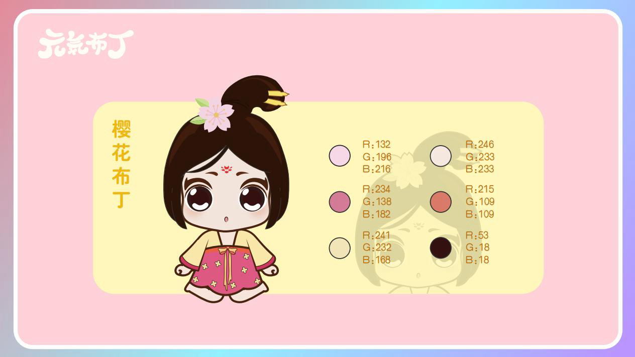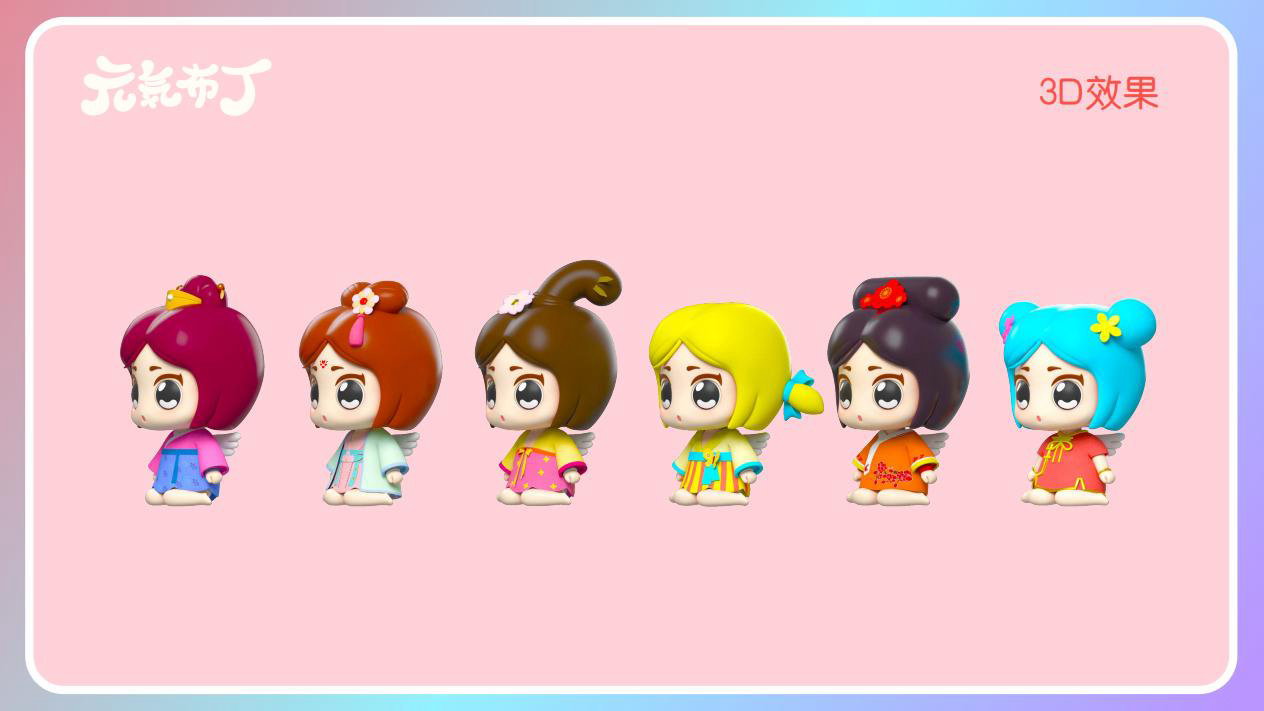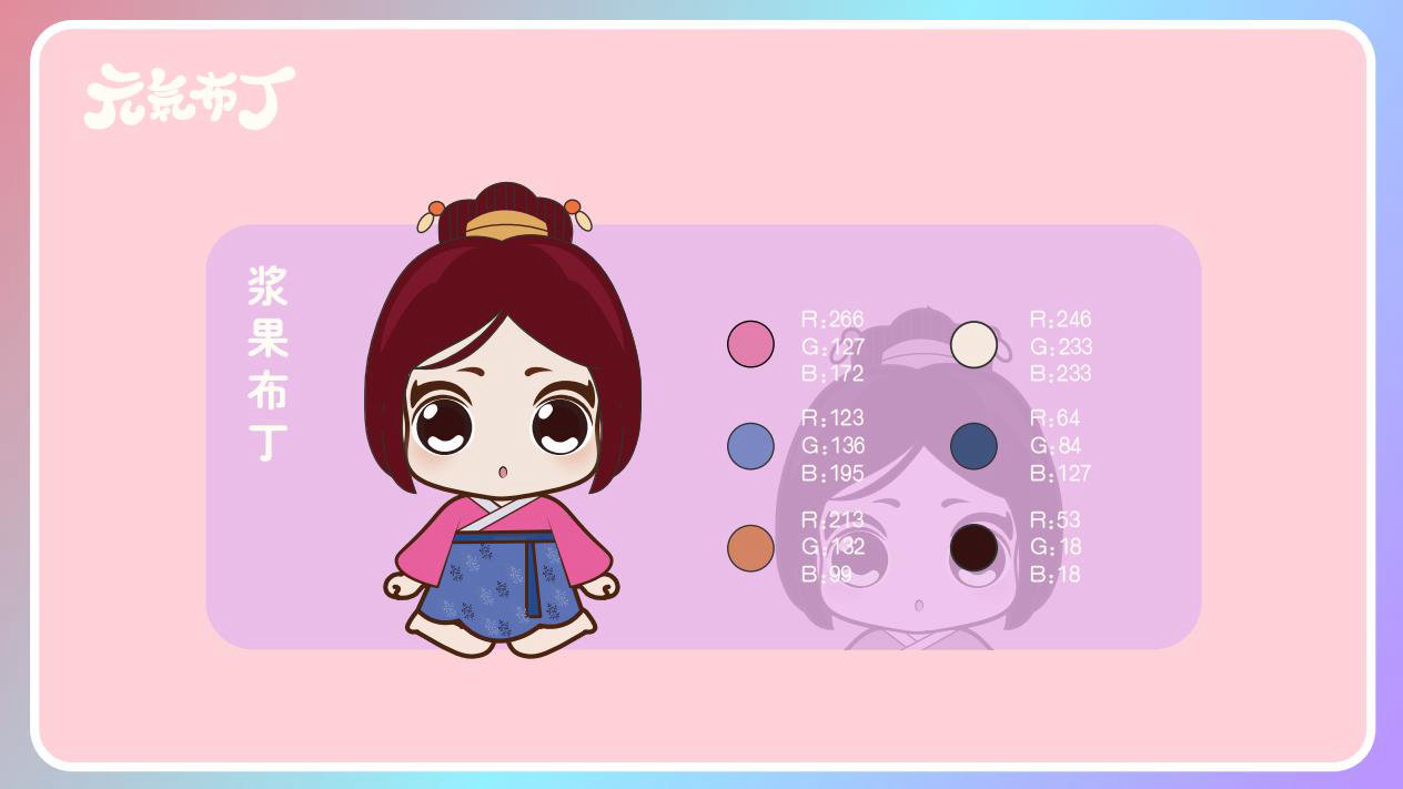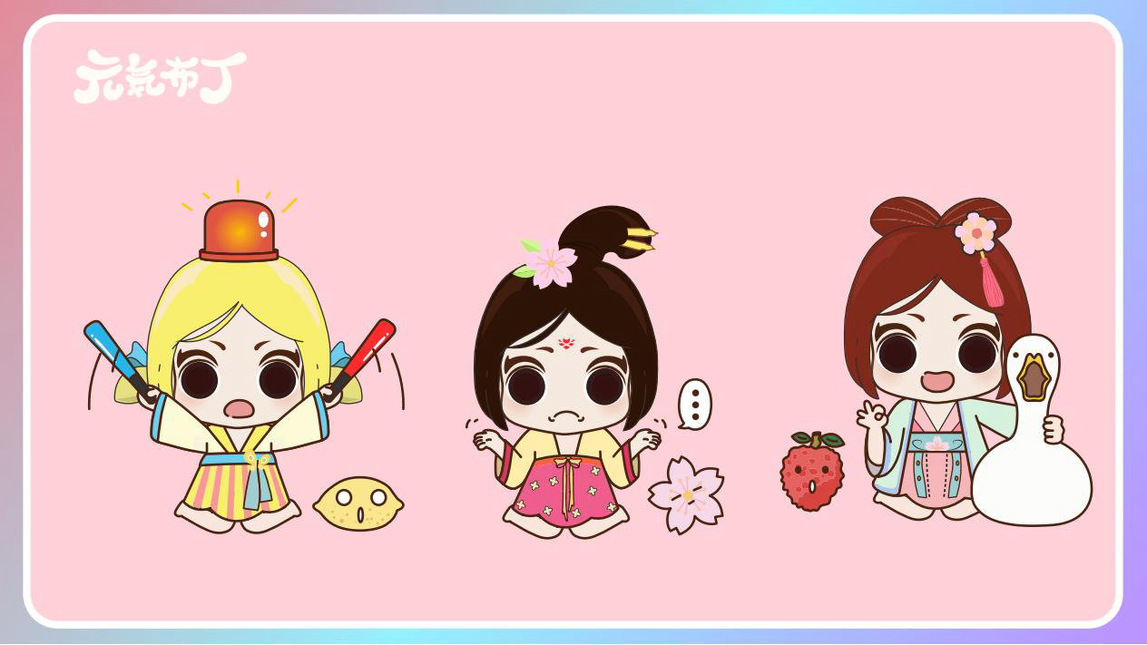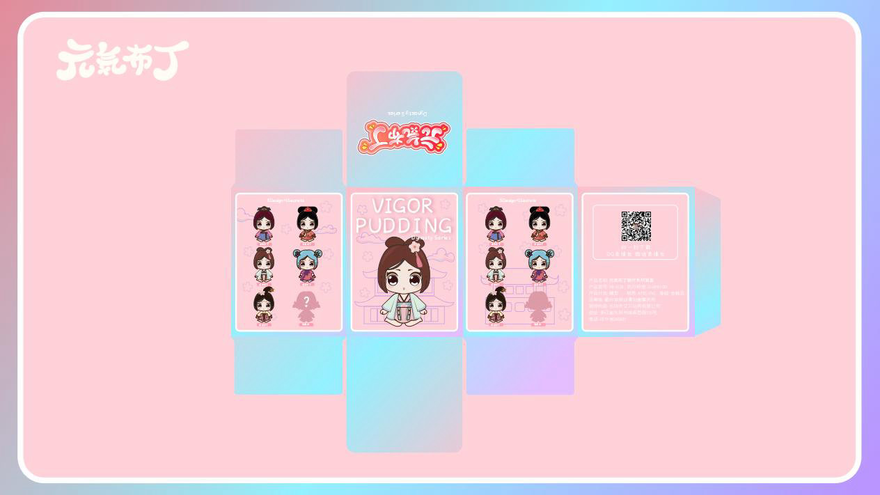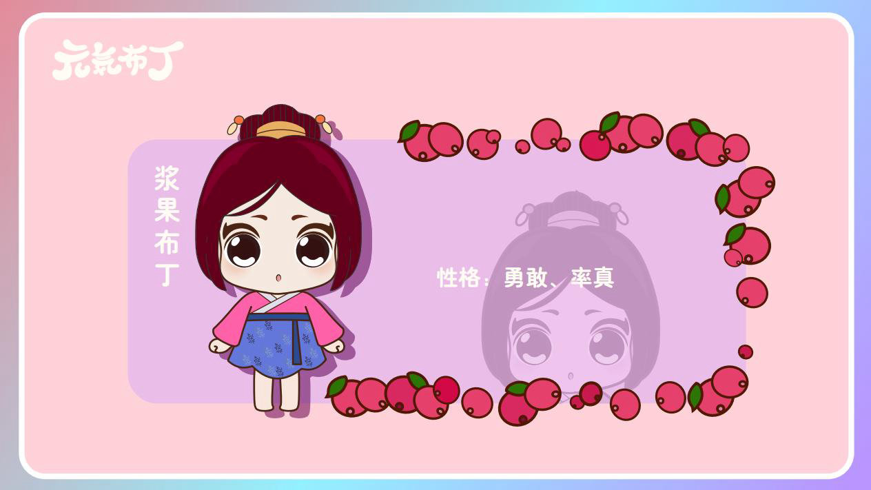 元気布丁是由六个头身比接近1:1的Q版卡通形象组成的女生组合,蛾眉杏眼、樱桃小嘴,身穿中国古代传统服饰。整体配色鲜艳丰富,象征着少女的活力和元气;表情呆萌,惹人喜爱。目前共有六个形象,分别身着秦朝、汉朝、唐朝、宋朝、清朝、民国时期的服装,配以不同的发型和发饰。