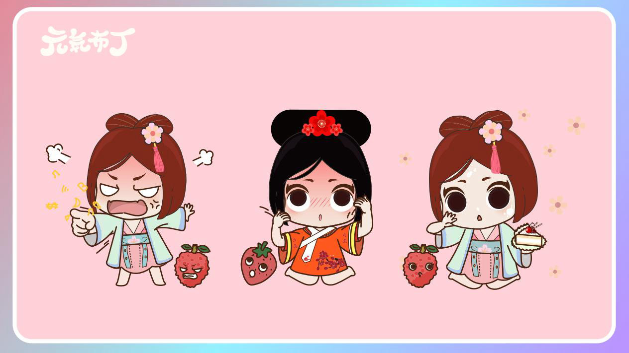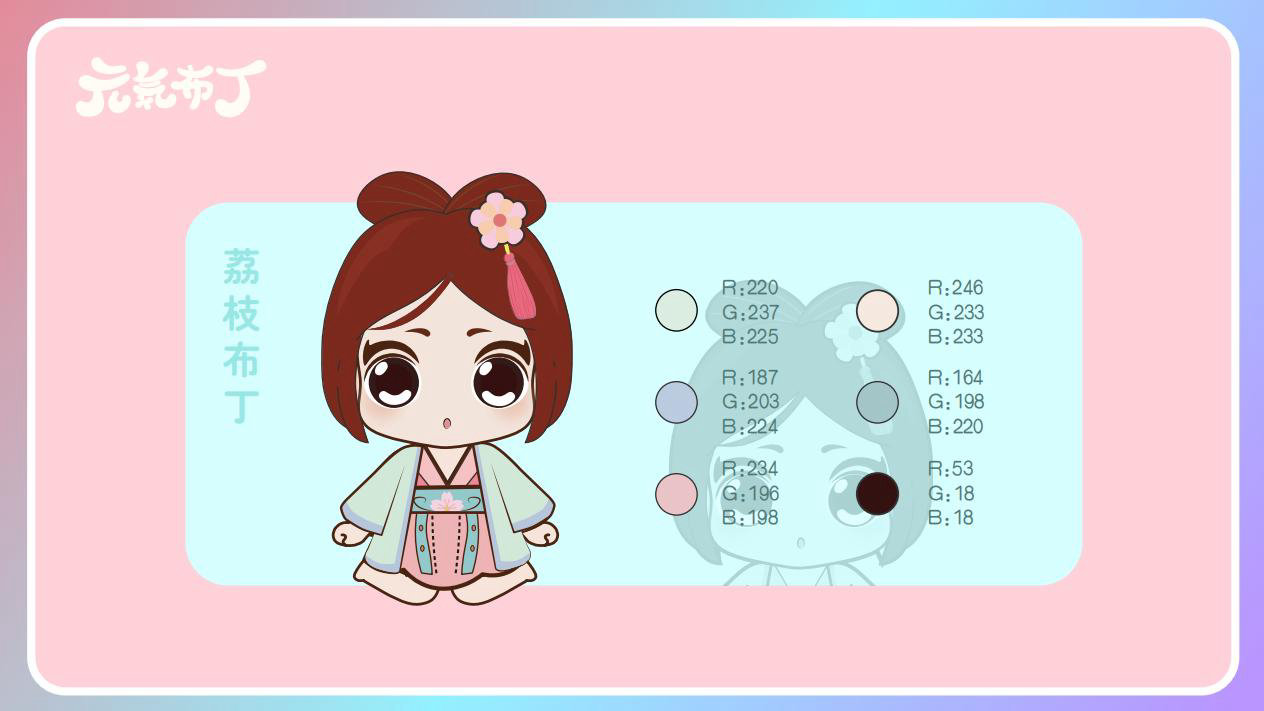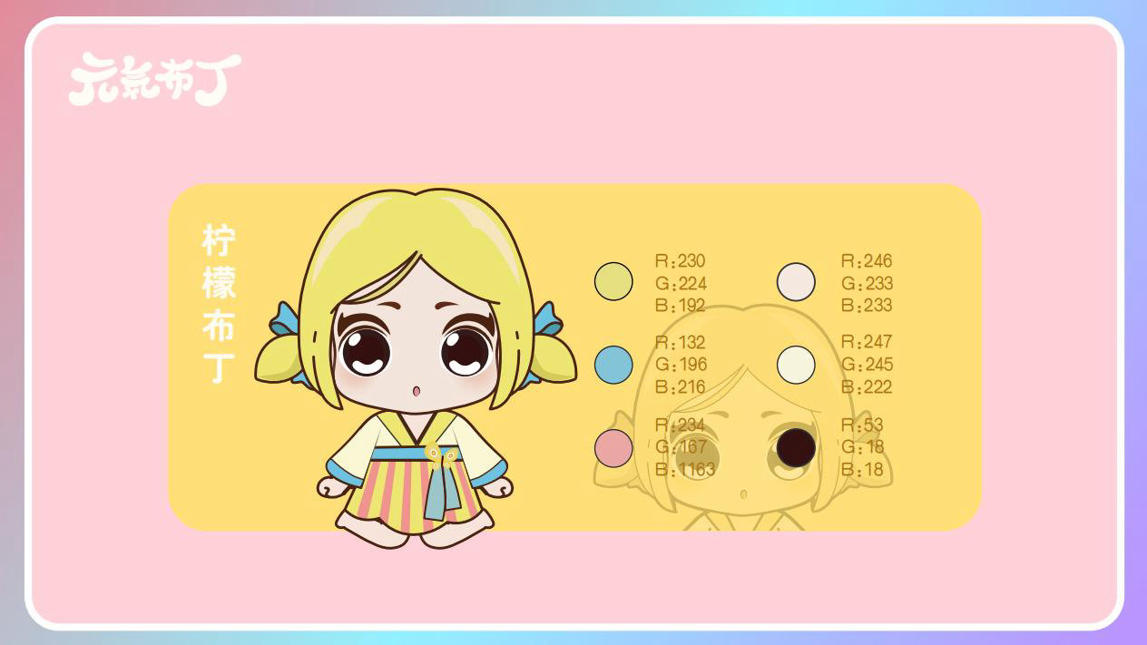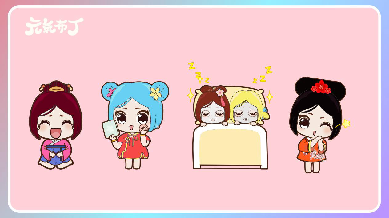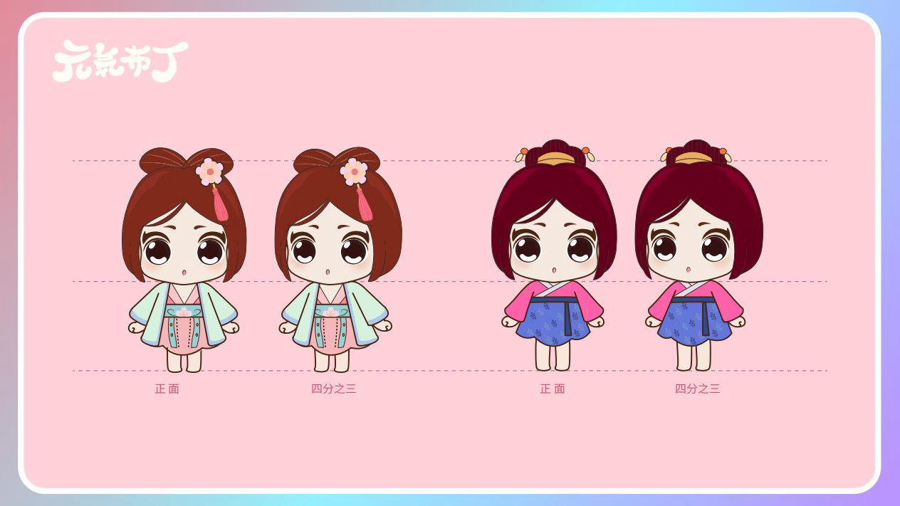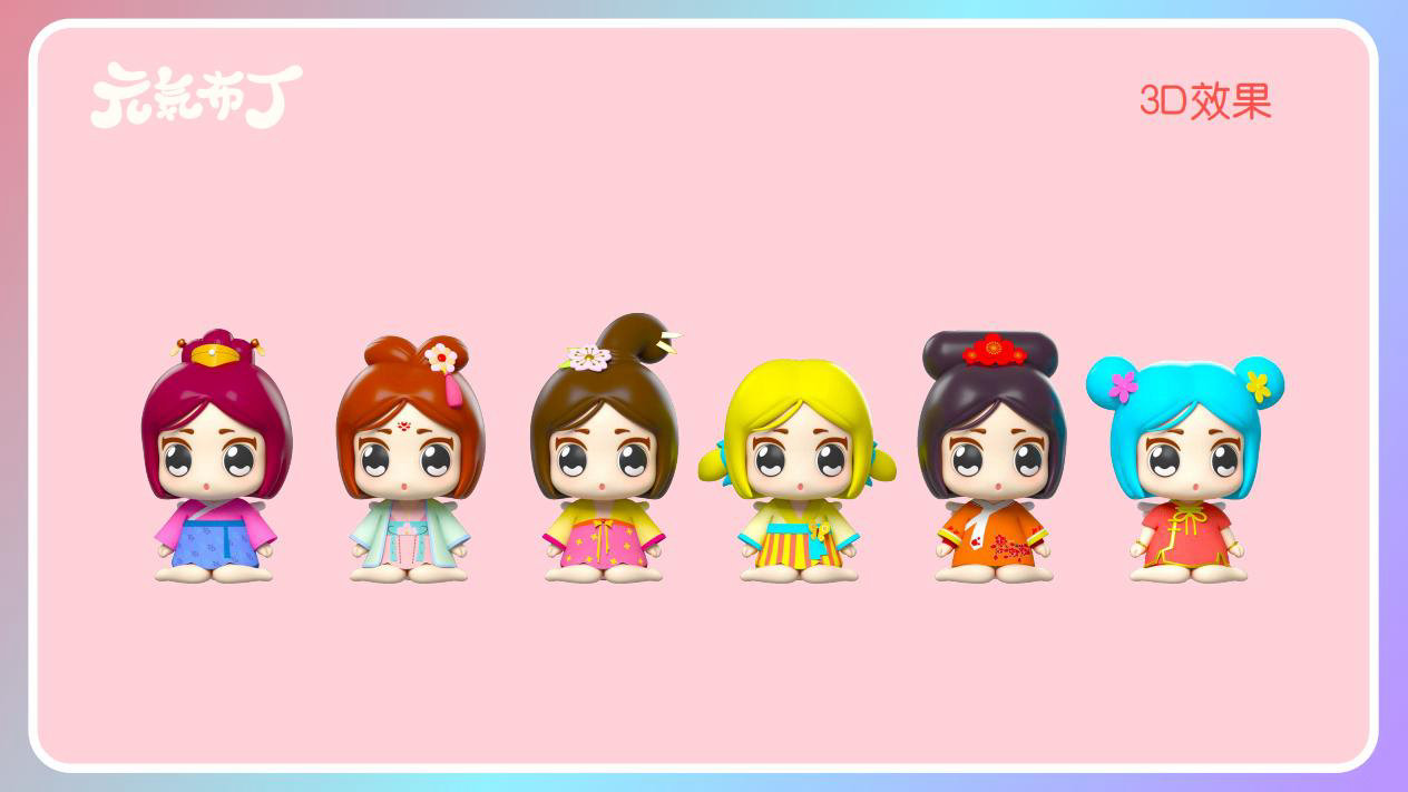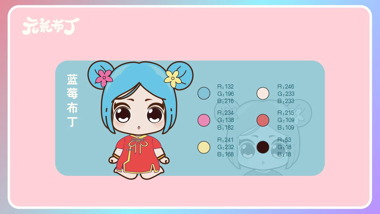 元気布丁是由六个头身比接近1:1的Q版卡通形象组成的女生组合,蛾眉杏眼、樱桃小嘴,身穿中国古代传统服饰。整体配色鲜艳丰富,象征着少女的活力和元气;表情呆萌,惹人喜爱。目前共有六个形象,分别身着秦朝、汉朝、唐朝、宋朝、清朝、民国时期的服装,配以不同的发型和发饰。