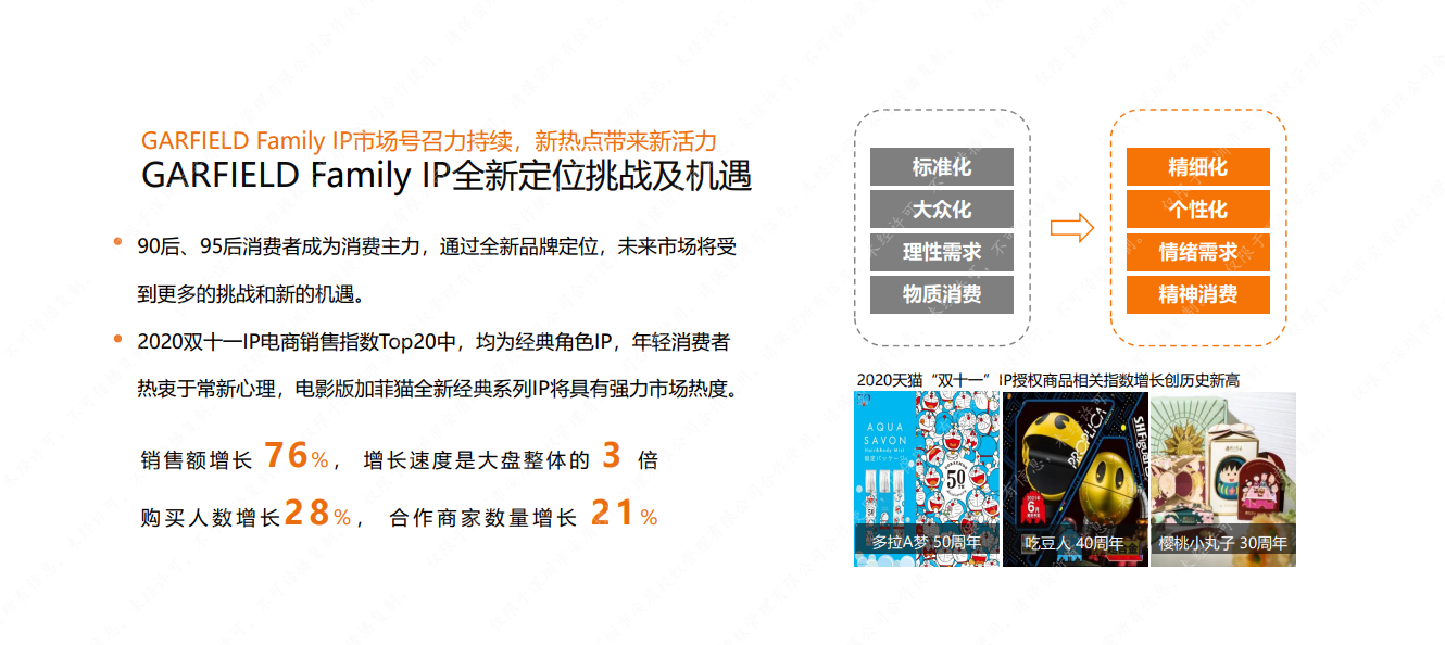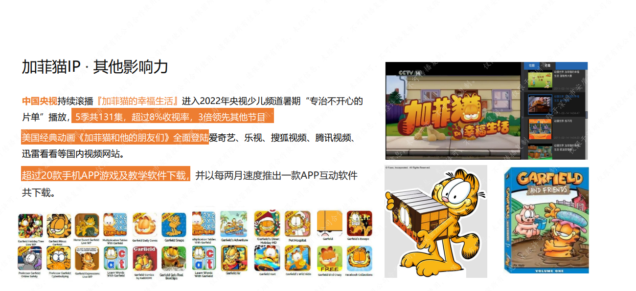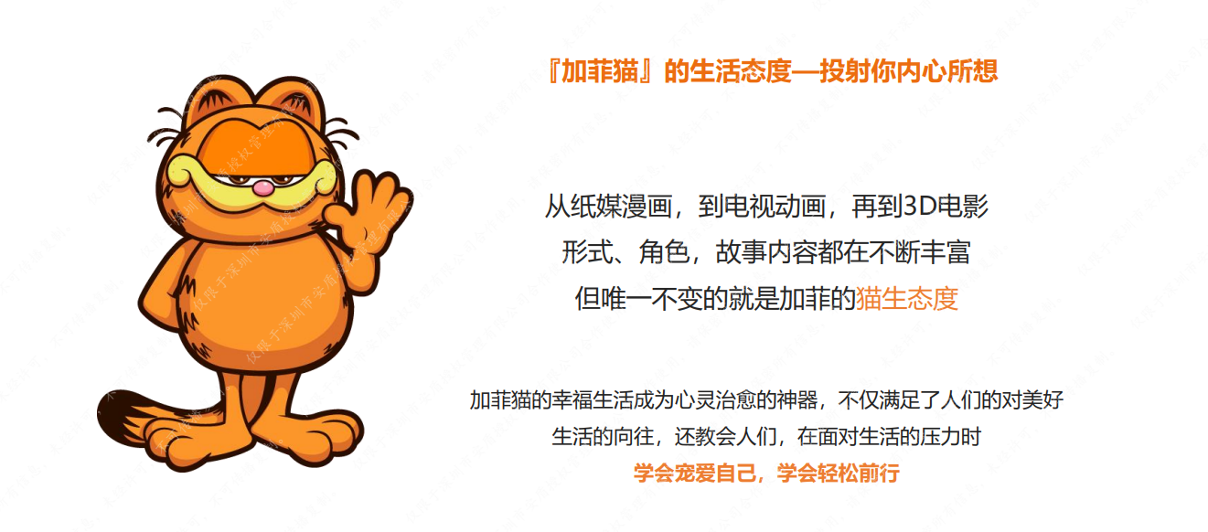 『加菲猫』的生活态度-投射你内心所想 从纸媒漫画,到电视动画,再到3D电影形式、角色,故事内容都在不断丰富但唯一不变的就是加菲的猫生态度 加菲猫的幸福生活成为心灵治愈的神器,不仅满足了人们的对美好 生活的向往,还教会人们,在面对生活的压力时 学会宠爱自己,学会轻松前行
