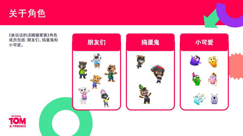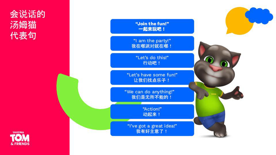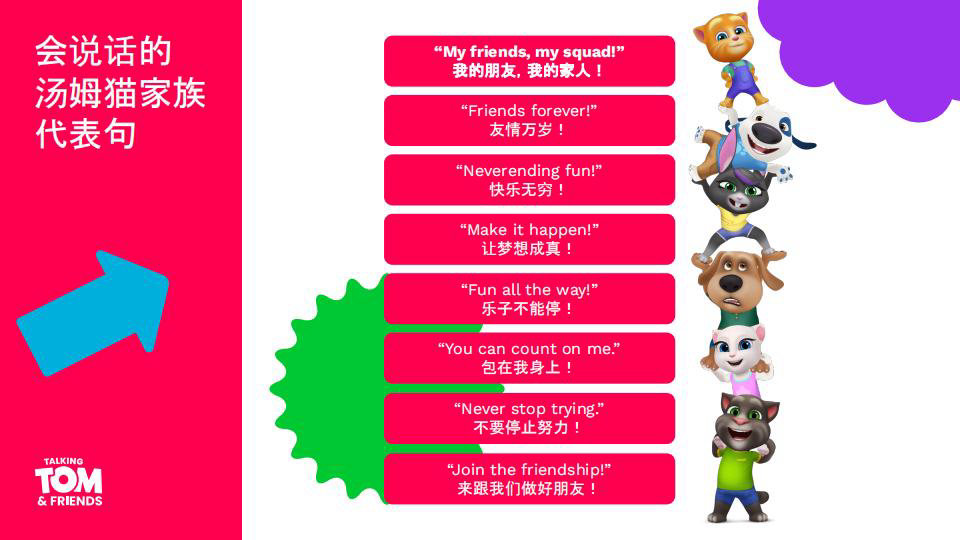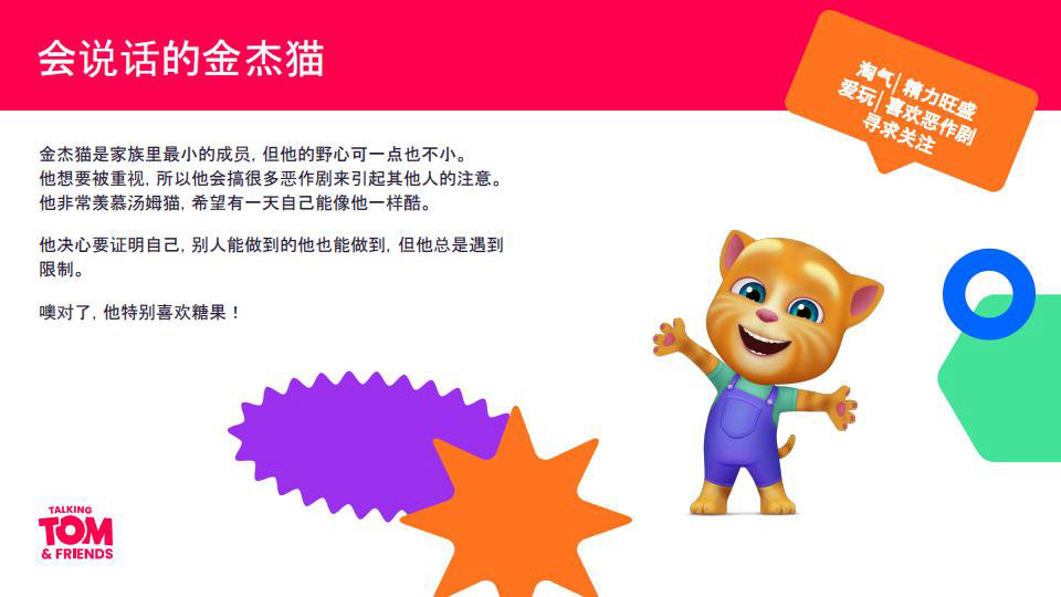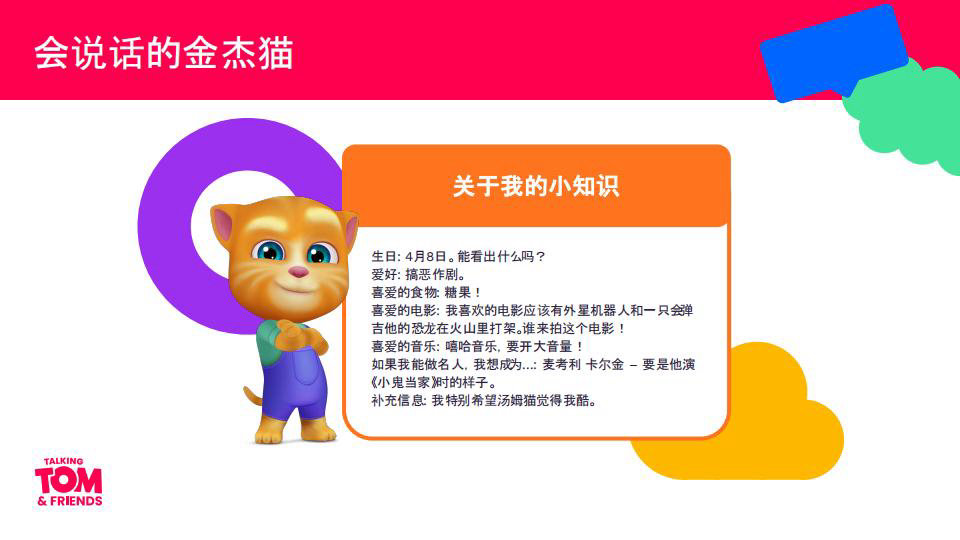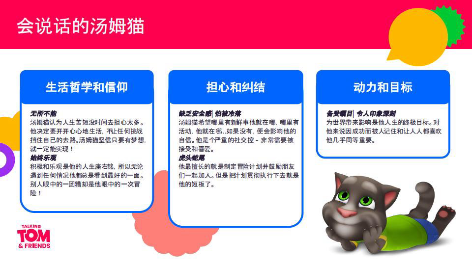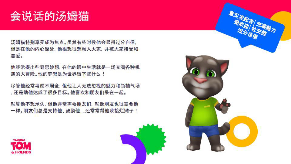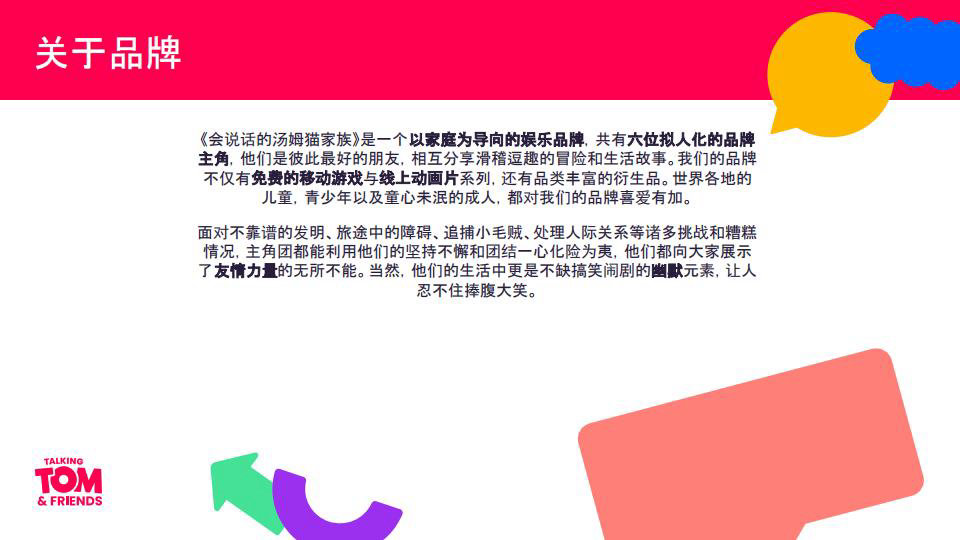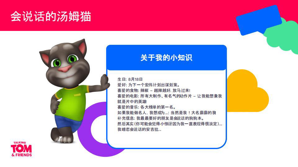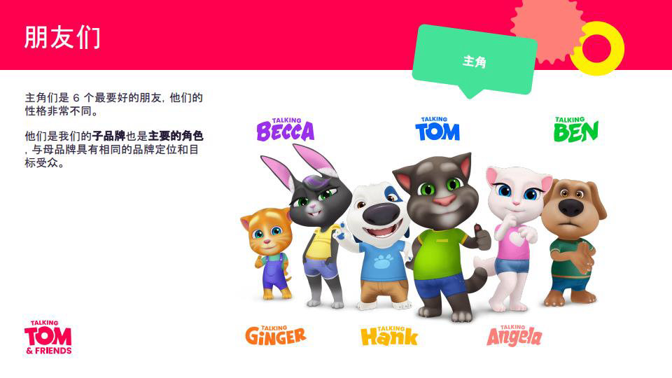 《会说话的汤姆猫家族》是一个以家庭为导向的娱乐品牌,共有六位拟人化的品牌主角,他们是彼此的朋友,相互分享滑稽逗趣的冒险和生活故事。