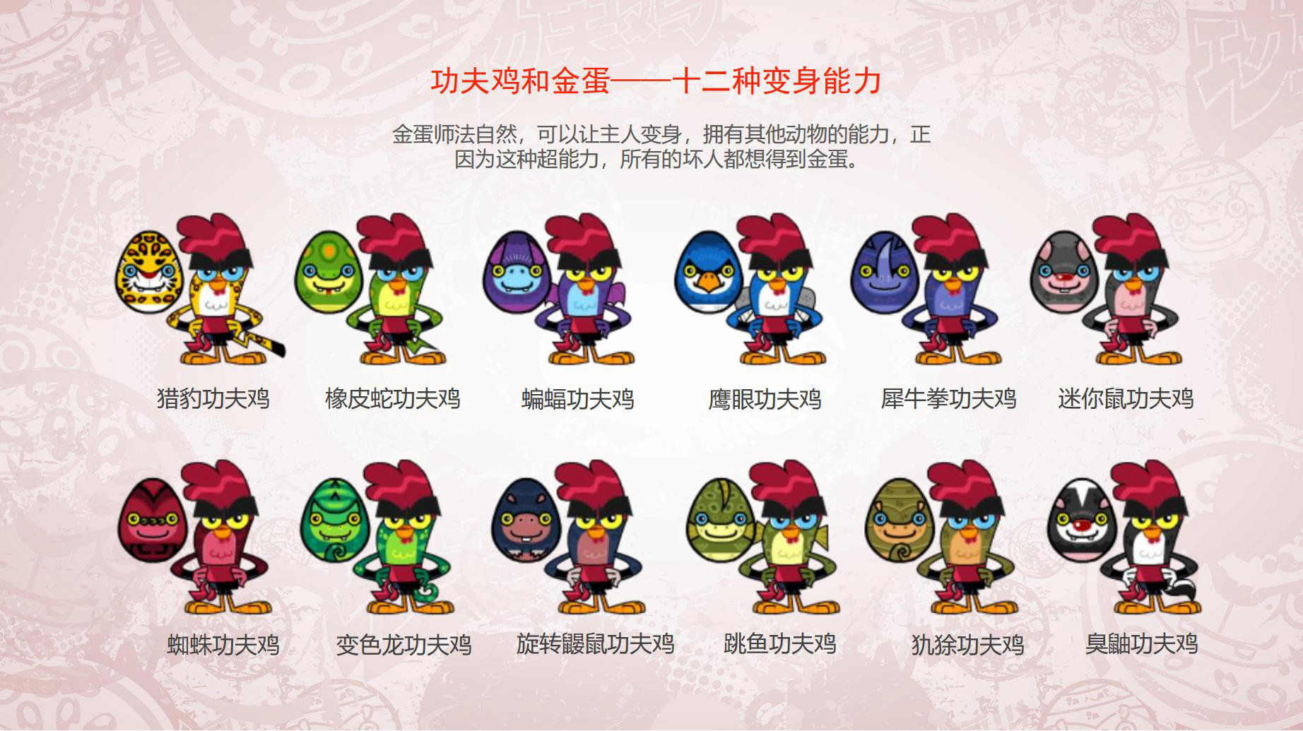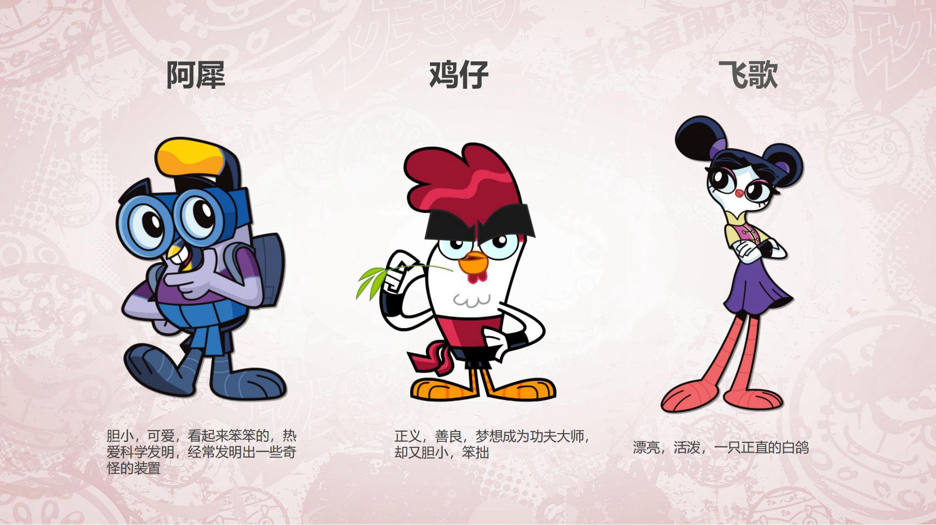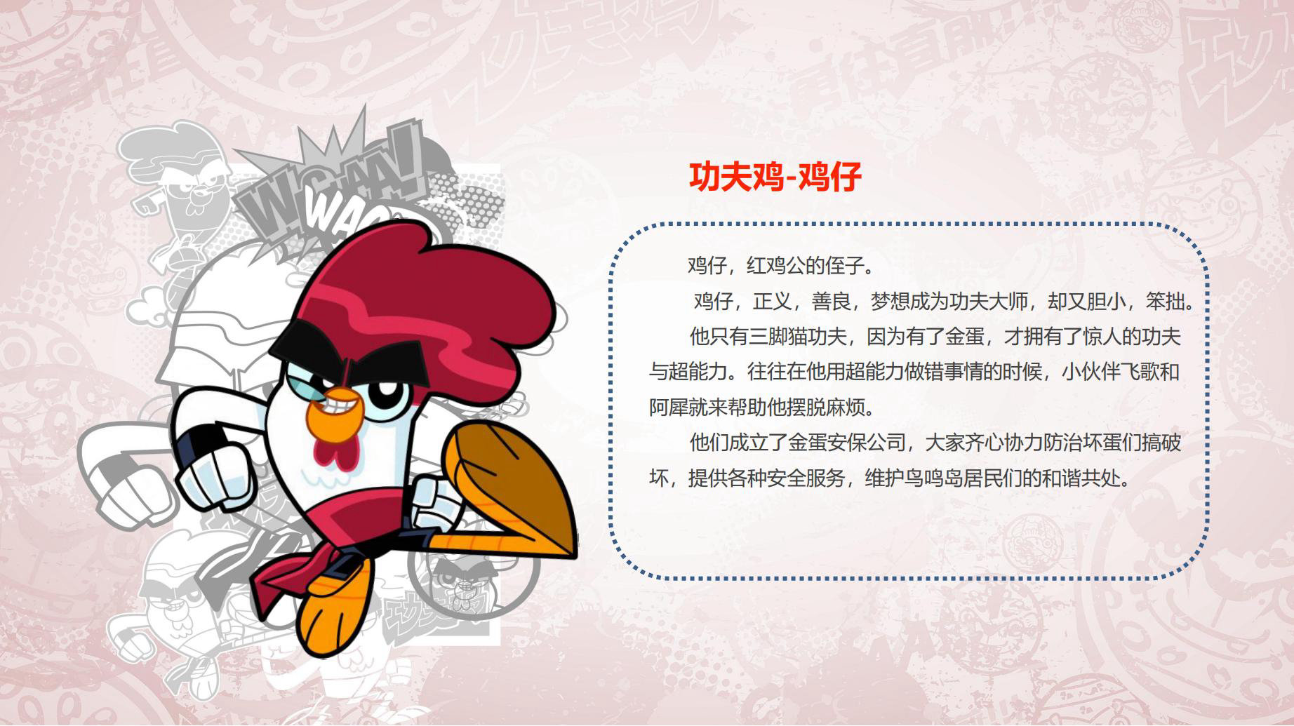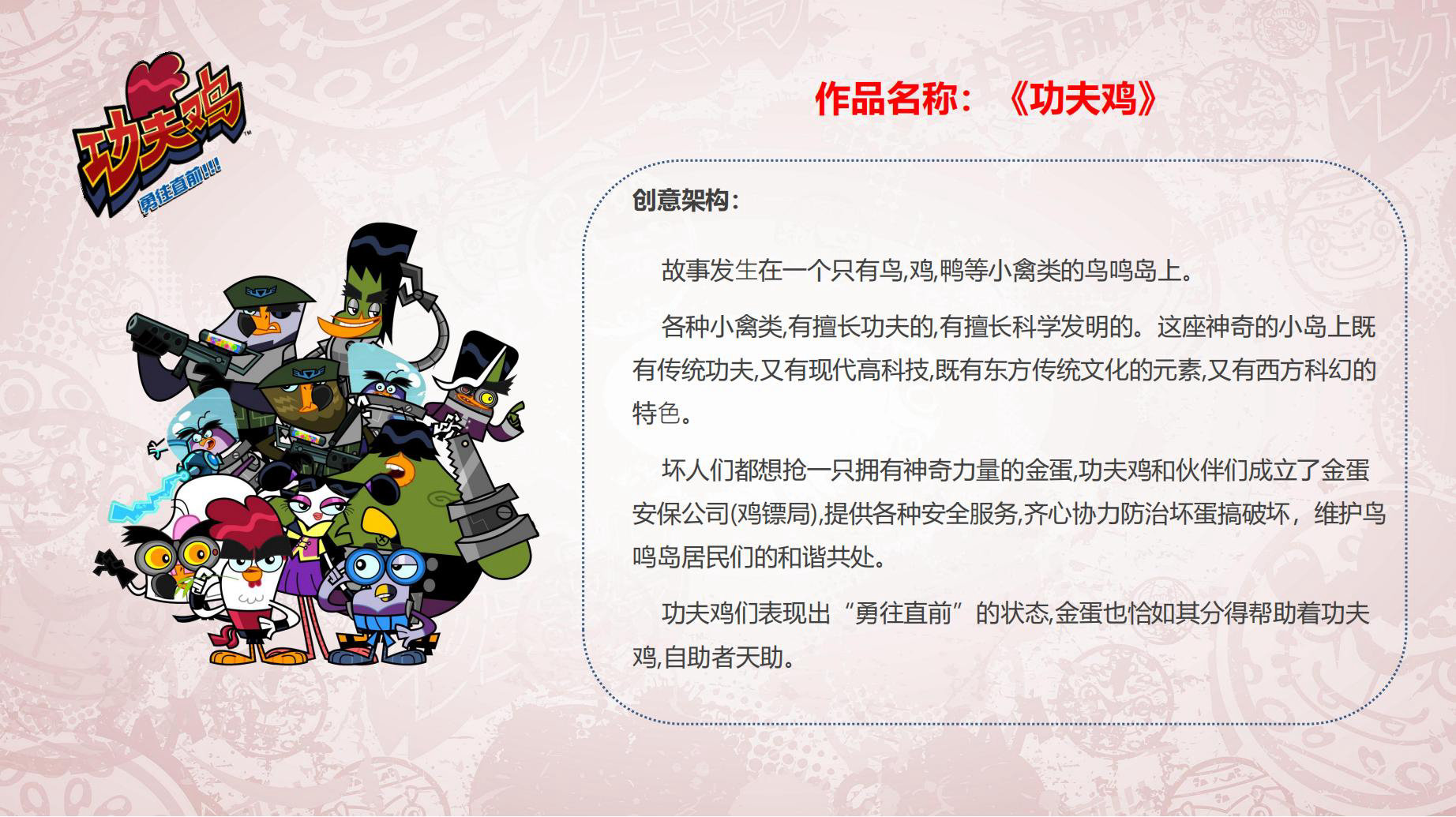 故事发⽣在一个只有鸟,鸡,鸭等小禽类的鸟鸣岛上。各种小禽类,有擅长功夫的,有擅长科学发明的。这座神奇的小岛上既有传统功夫,又有现代高科技,既有东方传统文化的元素,又有西方科幻的特⾊。