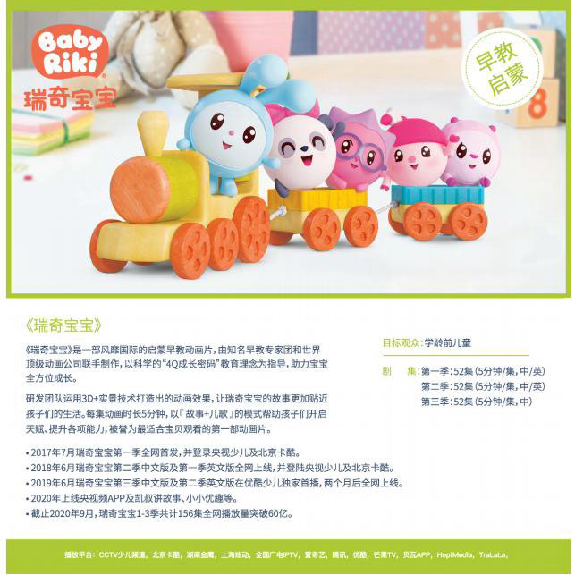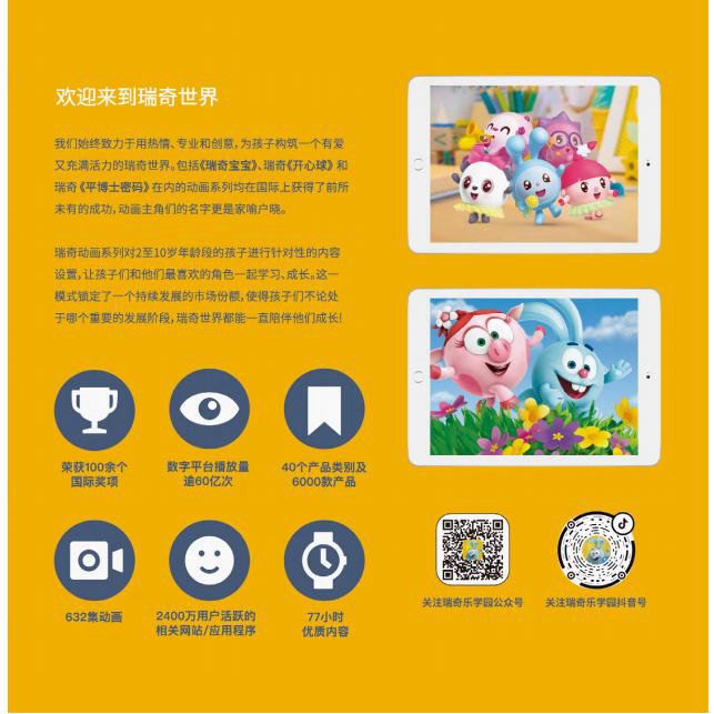 我们始终致力于用热情、专业和创意,为孩子构筑一个有爱又充满活力的瑞奇世界。 瑞奇动画系列对2至10岁年龄段的孩子进行针对性的内容设置,让孩子们和他们喜欢的角色一起学习、成长。